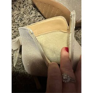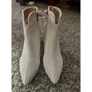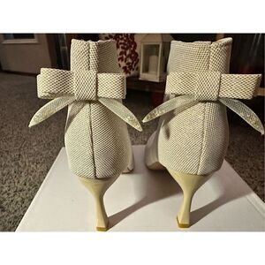 Beautiful sparkling pointed toe with Bow detail on back zip up booties. Color beige/champagne.