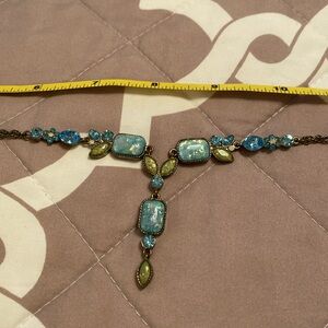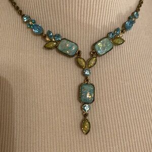 This piece is gorgeous!! Costume jewelry… opal, topaz like stones!! So much detail!! Lobster claws clasp.. looks like brass metal… is stamped… but I can’t read it🤓