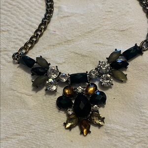 This is a beautiful multicolor statement necklace perfect for your collection. Faux diamonds along with dark green, yellow and black gems. Claw clasp and smaller rings enable you to choose where it falls on you. Perfect to dress up any outfit. Measures 21 inches from point to point. Perfect for your collection