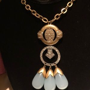 Gorgeous Bohemian Style statement necklace. Gold tone with clear crystals and 3 light blue gems. Can be shortened or worn long. 38” from one end to the other donuts 19” with the clasp on the last loop. This was a gift last year and I moved and forgot about it. Just found it and has never been worn.