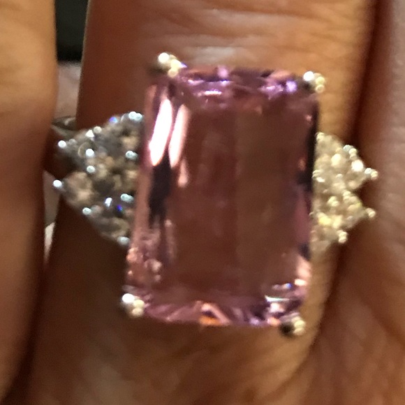 18k White gold filled pink emerald cut CZ with small round CZ on each side