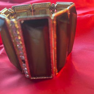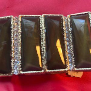 the pictures don't do this beautiful bracelet justice. it has jade colored 2 inch panels separated by rows of crystals. tag is still attached, make an offer
