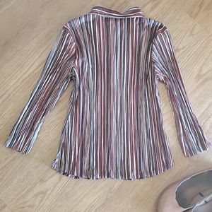 Pretty striped fall color button down top. Fred David brand strech, size small. Crinkle fabric with some strech. Dark red/oranges with creams and browns. Buttons down the front with 3/4 sleeves. Perfect for autumn season!