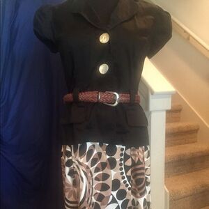 Beautiful outfit, one of my favorites .Black top with mother of pearl buttons.Size 8 Petite. The zipper of the skirt doesn't go all the way up but it's covered by the shirt and has a hook for closure.See picture. Made by Studio1. This is not the original belt it came with and is not included.