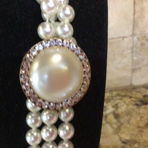 Beautiful three tier faux Pearl necklace. The necklace has a larger pearl surrounded in rhinestones. It’s about the size of a half dollar. The necklace is a slip on over the neck no class. I am still running that special if you purchase 10 listings of Jewelry under the price of $20 you get 50% off the entire purchase. If you have any questions please contact me. Thank you and have a great day.
