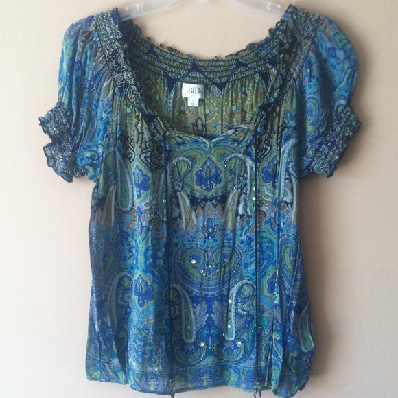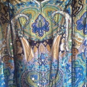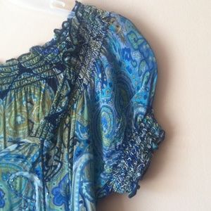 Multicolored blues n greens top. Light weight Smocking on collar n sleeve Bo ho style