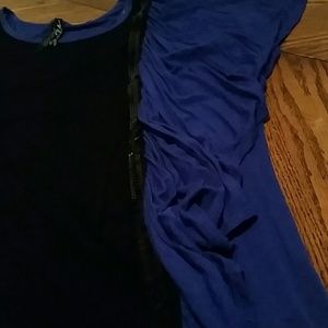 This is simply gorgeous! The top is blue except for the front black section. On the left side, there are 3 lines of sequins, leading into the blue ruffle. This is long and could easily be worn with leggings. It would also look good with pencil skirt or slim fitting dress pants.