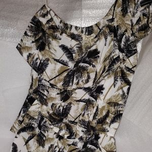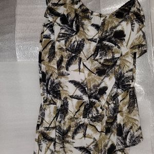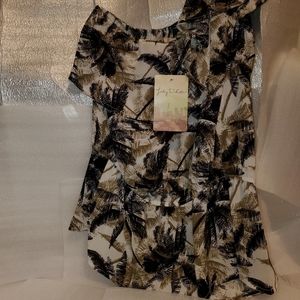New with Tags! Lily White One-Shoulder Palm Tree Print Ruffle Blouse, Juniors size Medium (women's size Small), sleeveless, stretchy elastic band along top & waist, black & tan color palm print on an off-white background, measures approx. 17" from underarm to underarm & 25.5" top to bottom, 100% polyester, perfect unworn condition!