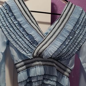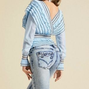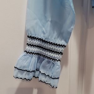 Style Boho, deep V neck, details, Ruffle, sheer, lettuce trim,wrap. 100 % polyester, season Spring, summer.