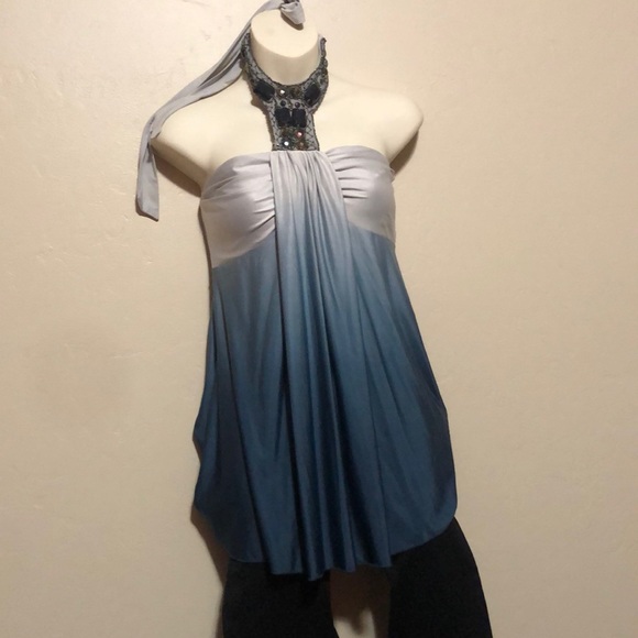 Stretchy, flowy top with beautiful detail on the collar! Silver and teal