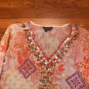 This is a really beautiful piece. Very soft and light weight with beading and sequins. Can be used as a cover up or with leggings. Smoke free home. ❤️