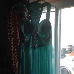 Turquoise floor length dress. I bought it for prom and wore it once. It has beautiful beading on the front straps and the back. No blemishes, still new. I bought from Macy's. Not a cheap dress from goodwill.