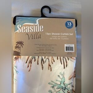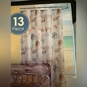 13-piece shower curtain set featuring ocean-themed design. Includes hooks.
