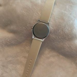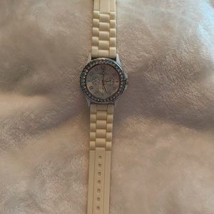 Beautiful Silicone watch in WHITE color, excellent condition, silver tone hardware, needs battery ( glass is not broken,it’s a reflection of my phone )