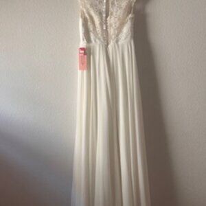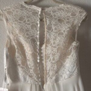 Very pretty ivory dress, light, flowing w sweetheart lace top, cap sleeve, button down bodice in back, never worn, tags attached.