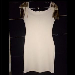 All white beautiful party dress with gold shoulder chains and spikes. This dress is to die for. Only a one time wear so the dress is in mint condition. (I wear all my dresses one time only) Perfect for an all white affair or ladies night out either way you'll steal the night in this stunning piece. Size 6 true to size. Perfect for those with curvy build with a slim waist.