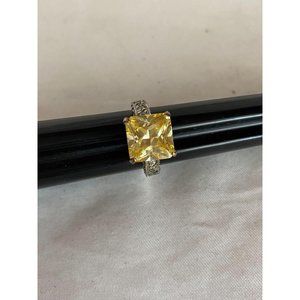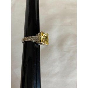 Beautiful costume ring, yellow cz, silvertone setting size 7 Several clear czs in the setting. no missing stones