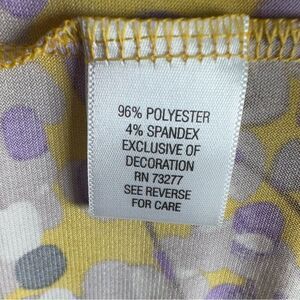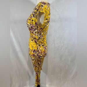 Beautiful yellow and purple abstract print keyhole ruched stretch dress medium
