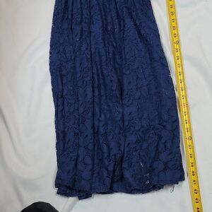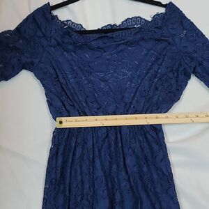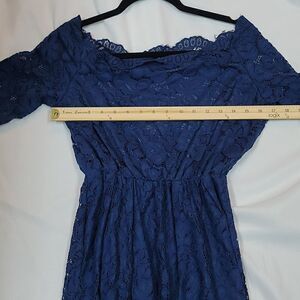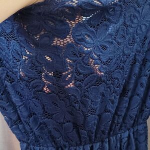 Very pretty blue lace dress! With a scalloped lace neck and a see thru lace back this dress really says pretty! Pre-owned in good condition no stains, rips or snags...no belt and no size or material tags whatsoever on this dress but due to measurements I am sizing it a Small...it does have a lining cover the front and the skirt back is unlined...I don't know what the material is made of....