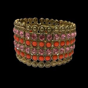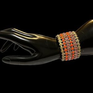 Beautiful gold , orange enameled , pink rhinestone bracelet. It is a stretch bracelet with good elastic. Fits like a cuff . Really pretty piece.