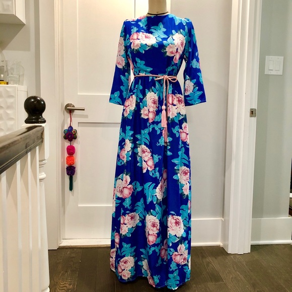 Gorgeous floor length royal blue maxi dress. Unlined. Rope belt not included. No stretch; 32in at natural waist, 38in bust. 57.5in long. Never worn but no tags. Sized L but definitely fits like an M.
