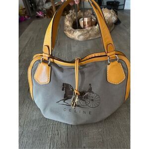 Guaranteed authentic. Stunning and rare vintage Celine carriage bag in fabric and yellow ocher leather details.