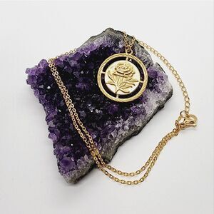 Beautiful Classy Rose Floral Emblem Pendant Gold Toned Necklace 18"