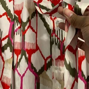Ladies super cute multicolored abstract geometric print button down 3/4 sleeve shirt dress with matching detachable sash by Escada. Excellent condition. Ladies size 38 euro or US size 6/8.