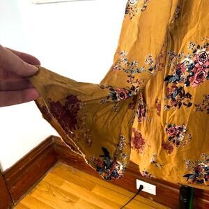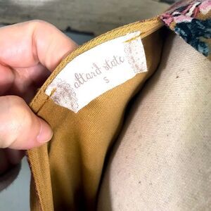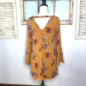 Beautiful size small boho style mini dress with long bell sleeves by Altar’d State. Mustard yellow background with pink, magenta, black, green, and white floral design. Double v-neck with back strap adding just a little extra to the already gorgeous design. Reminds me of a piece Alexis from Schitt’s Creek would have in her closet. Perfect everyday or for date night. It’s in excellent used condition with no known flaws. Comes from a smoke free home.