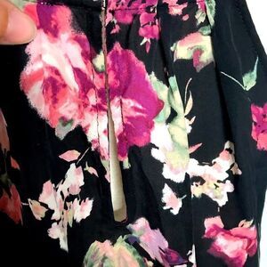 Beautiful size medium floral halter top by Joise. Black background with pink, white, green, and purple floral print. A functional back button eyelet closure and bottom elevator hem to give a tucked in look. 100% silk. Cute worn alone or with a blazer or cardigan for a more business casual look. It’s in excellent used condition with no known flaws. Comes from a smoke free home.