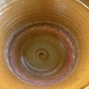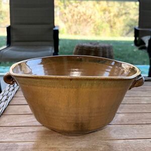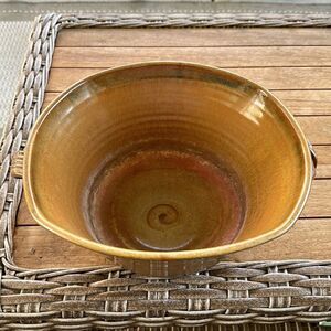 Tannish-gold pottery bowl with a glaze coating and two twist knot handles. This piece is stunning in person. Has signature on the bottom covered by 2 felt pieces. EUC