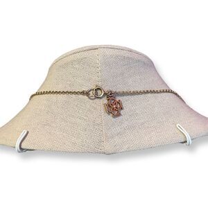 Beautiful gold tone long necklace with rhinestone and gold connectors spaced throughout the necklace. Great for everyday wear and it provides a little bit of bling. It is 34” long. It has a company’s charm on the back but I don’t know what company it is from.