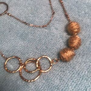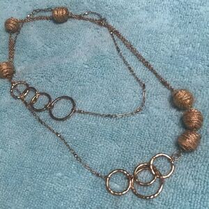 This necklace can be doubled or worn as a single strand. The gold chain has hoops and metallic wrapped gold beads.