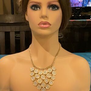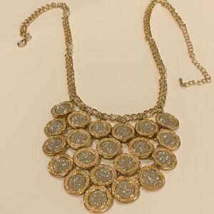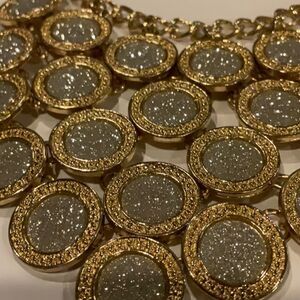 Gold and silver vintage statement necklace with circles in silver edged in gold with a gold chain with and extension chain and lobster claw clasp. Well made costume jewelry.