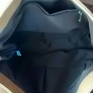 This leather bag is large enough to hold all your goodies! 14 across 10.5 tall, 4deep. Two side pouches.Inside has two pouches and one zip. Buckle closes with magnet. Brown detail. Like new!