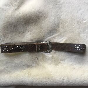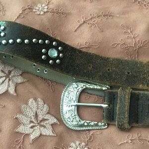 This is a distressed leather belt with a silver buckle. Classic western look. Great design! Used in good condition. Shows some wear on inside of belt.