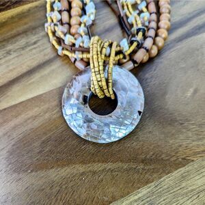 Beautiful statement piece with perfect blend of wooden and shell beads with large shell-like ring pendant