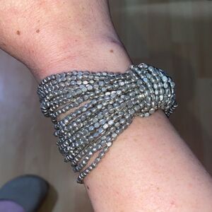 Kinda heavy weighing in at 4.4 oz multilayered (22 strands) silver statement bracelet. Stretchy making it easy to put on and take off. When worn it looks like a shiny silver bow