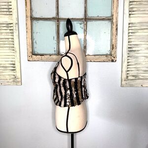 Beautiful and sexy size small sequin crop top by DO + BE. Black and white stripe pattern with sequins that can be roughed up to expose a gold under face. With v-neck style neckline. Making this a really unique and fun top perfect for parities or to wear to the clubs that are now open. Advisable shoulder straps for comfort. It’s new with tags and has no known flaws. Comes from a smoke free home.
