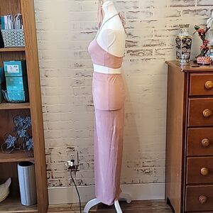 Beautiful halter to and slit skirt! Very soft in this pretty light rose color with gold accents! Barely worn condition... Yes, there is a little stretch...
