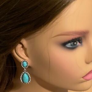 Adorable new silver overlay Southwestern turquoise dangle pierced earrings . Approx 2 inches long and less than 1 inch wide. These cute Southwestern earrings are sure to turn heads and will dress up any outfit in that Southern western style.
