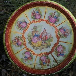 Large tin tray with beautiful scenes of a french country couple. Vibrant colors. Can be hung on the wall with a command strip. Lightweight. There is a scratch and pinch in tin...hard to see. 12"
