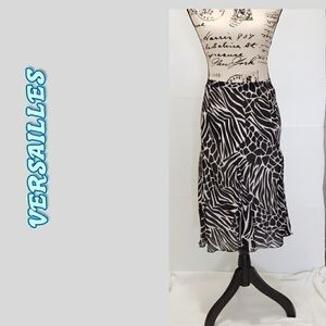 Size large has a full bottom and a light material fully lined excellent used condition no damage noted no pilling no stains no marks no pulls. Elastic waist. Model set to 5'4" skirt would hit below knee