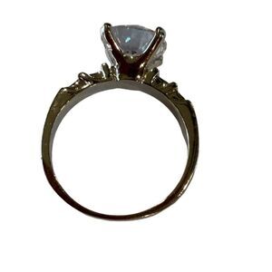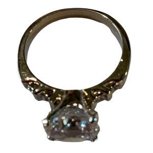 Beautiful silver engagement ring with large center round CZ and 2 square cut CZs on each side of the main stone. Size 9. Well made costume ring.