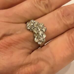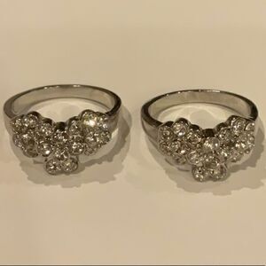 Adorable silver heart ring with rhinestones in the shape of a modern heart. Size 9. I think they may be stainless which means they will last a long time. These are vintage rings.