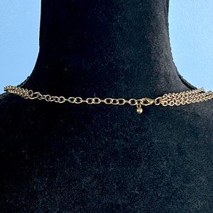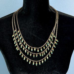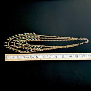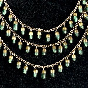 This antique gold tone necklace is a statement piece with beautifully detailed green dangle tube beads. The delicate 3 strand construction adds an extra touch of elegance to this already stunning piece. The necklace measures as shown in the photo and is made of high quality beads and metal. It is perfect for any fashion-forward individual looking to add a unique and beautiful piece to their collection