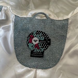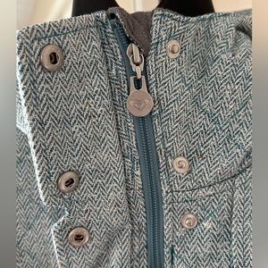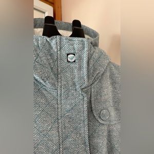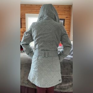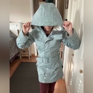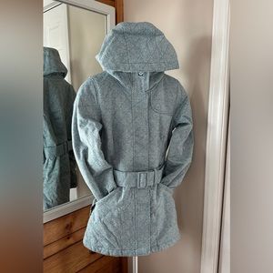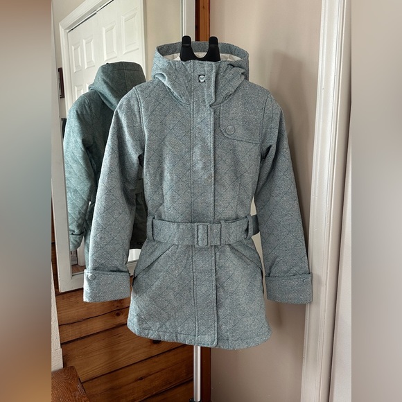 This Roxy coat is perfect for cold evening occasions. The belted waist is flattering, and the hood is large for extra coverage. It has deep pockets, a functioning zipper and reinforced buttons. The light blue texture is beautiful in person.