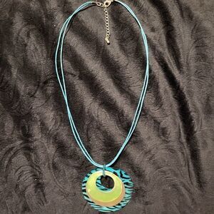 Beautiful necklace with 3 multicolored pendants, closes with hook clasp and can be adjusted in length, 1 pendant is lime green but see through, 1 pendant is silver, and 1 pendant is blue/black zebra striped. excellent condition.