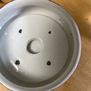 Three parts soap dish with drain green pink gold plated trim porcelain floral pattern several rough edges on bottom several small discolored parts inside.