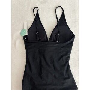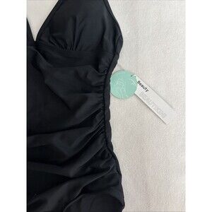 Look chic and flattering at the pool or beach with this Beautikini Womens Black One-Piece Swimsuit. Featuring a deep V-neckline and ruching at the midsection, this swimsuit enhances your silhouette while providing comfortable coverage.